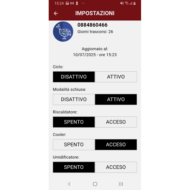 Maschineneinstellungen: Zyklusstatus, Brutmodus, Heizung, Kühlung und Luftbefeuchter prüfen.