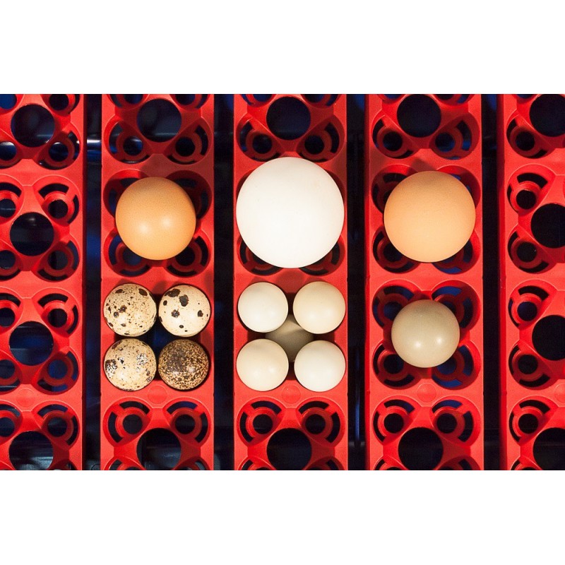 Der weltweit erste und einzige professionelle Eierhalter, der alle Eierarten – von Gänse- bis Wachteleiern – vertikal aufnehmen kann. Jeder einzelne Halter bietet Platz für bis zu vier kleine Eier anstelle eines Hühnereis. In diesem kompakten Behälter können bis zu 48 Wachteleier ausgebrütet werden, wodurch der Stromverbrauch deutlich reduziert wird.