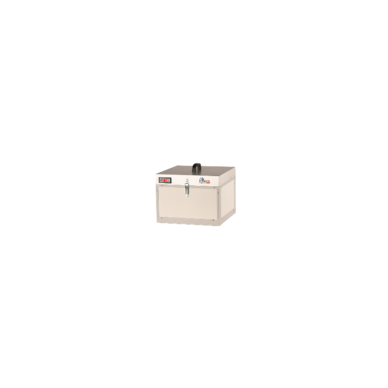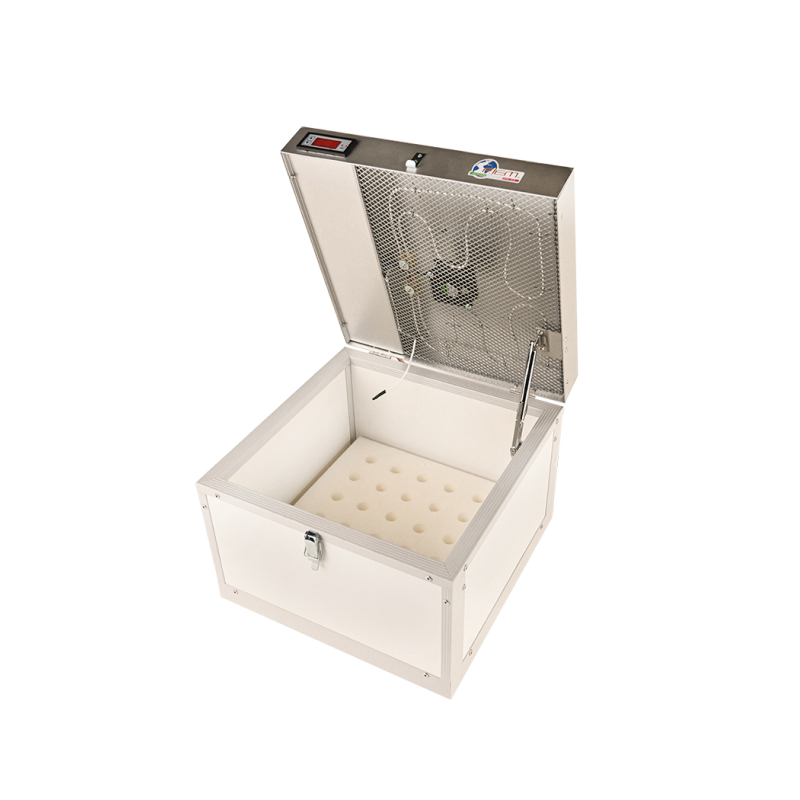 The Fiem beekeeping transporter for queen cells was developed to meet the needs of beekeepers who need to transport queen cells in optimal conditions. Its structure is made of 20 mm thick insulated panels, composed of polystyrene insulation and PVC lining, ensuring an effective thermal barrier. Internal heating is managed by a digital thermoregulator, allowing for precise temperature adjustment, with increments of up to tenths of a degree Celsius. A small integrated fan ensures even heat distribution within the transporter, avoiding uneven temperatures. Power supply is flexible: in addition to the 12V cigarette lighter socket, it is possible to use an external 12V battery, making the device suitable for a variety of operating situations. A power supply for connection to the 220-240V mains is available upon request. The transporter is equipped with two queen cell holders, each with a capacity of 25 cells, allowing for the transport of a total of 50 queen cells. All electrical components comply with EEC regulations, ensuring safety and reliability during use.
