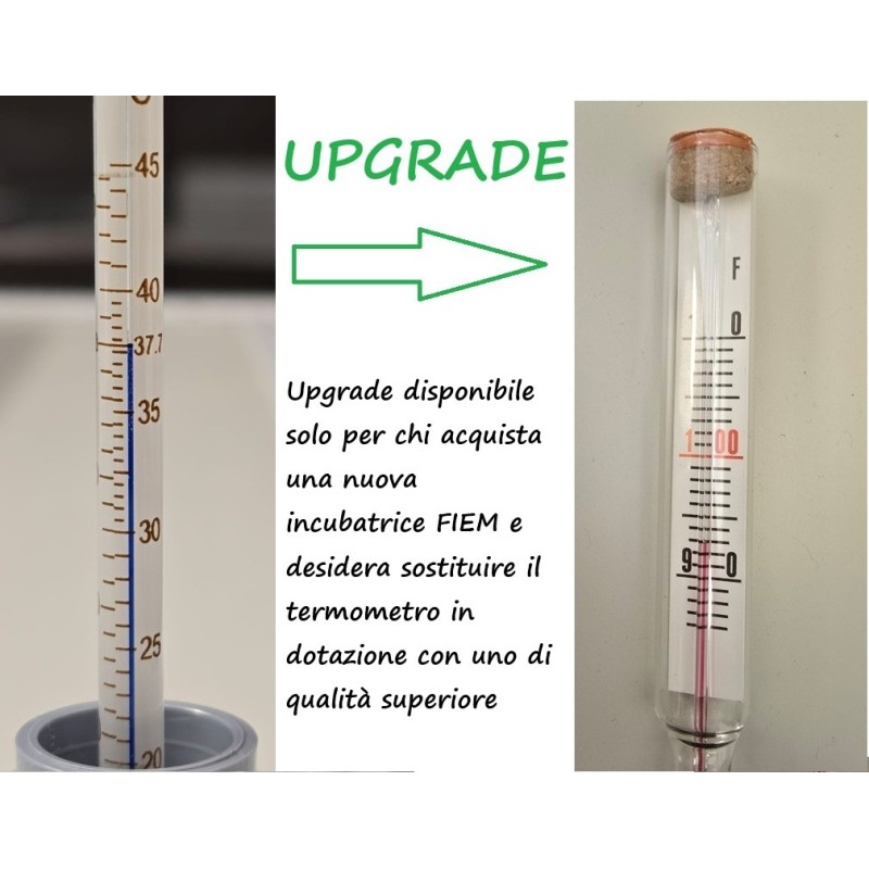 Upgrade available only for those who purchase a new FIEM incubator and wish to replace the supplied thermometer with a higher quality one . The FIEM Easy- Read Precision Thermometer ( 85–110 ° F ) , Made in Germany, offers a clearer and more immediate reading , perfect for quick and accurate checks . It maintains the accuracy of the standard model but with a more legible dial and a scale focused on incubation temperatures .