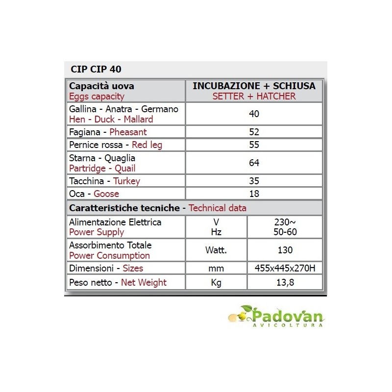 The CipCip 40 Mini LED is the natural evolution of the CipCip 28, designed for those who want greater capacity without sacrificing quality and ease of use. With a 2 cm heat-insulating PVC frame, it guarantees excellent thermal stability, making it suitable even for environments with unstable temperatures. padovanavicoltura.it