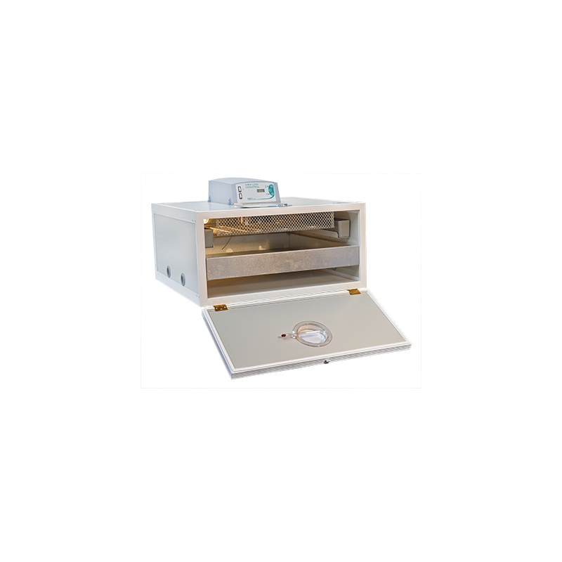 This model is equipped with decimal digital temperature regulation and a control thermometer in °F. Air humidification takes place via special heated trays located under the lid and the humidity percentage is displayed via a wet bulb hygrometer supplied.