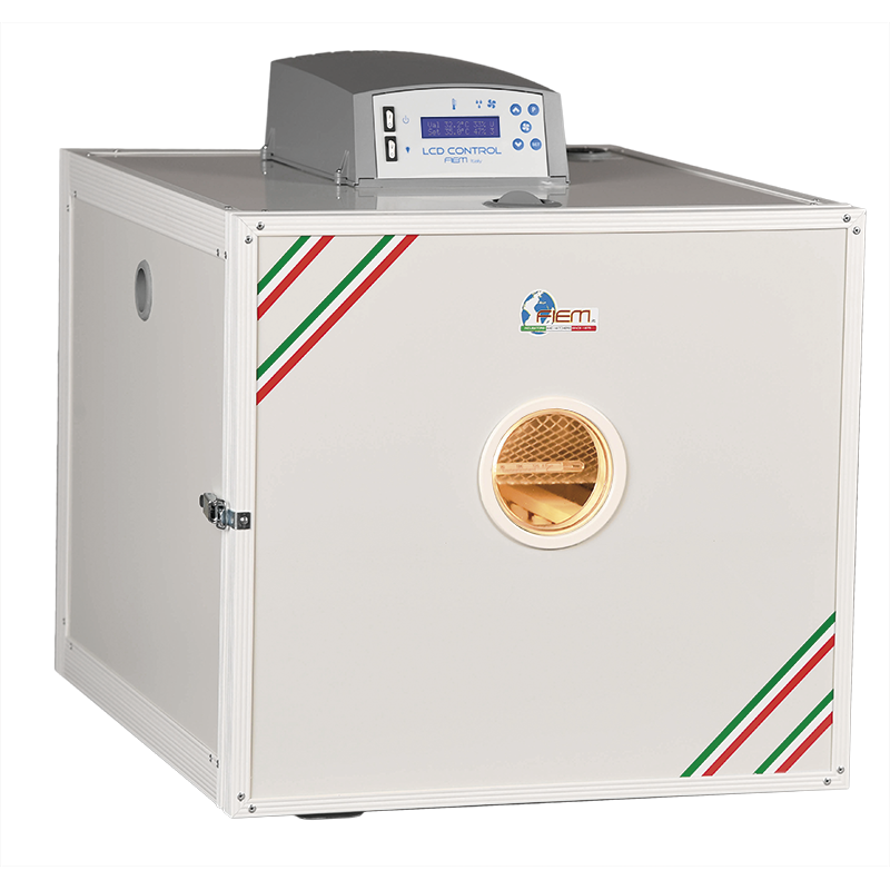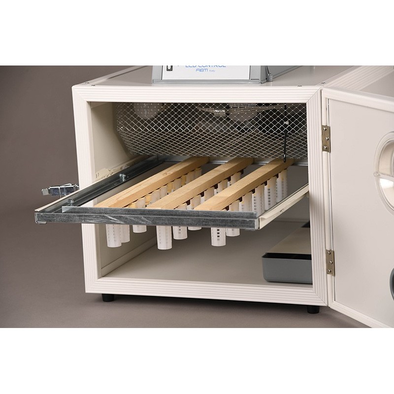 The Fiem A-100 incubator is suitable for incubating queen bees, drying pollen, and liquefying crystallized honey. It features a cabinet made of 20 mm thick chipboard or, optionally, insulated thermal panels with a polyester or PVC cavity. It features an indirect forced ventilation system with adjustable intensity, a multifunction control unit with a backlit LCD display, and PID temperature and humidity control. It has internal lighting and a °C alcohol thermometer for temperature control. Equipped with a natural surface humidification system using trays, it can be equipped with automatic humidity control upon request. Special removable drawer not included (optional). Slats not included, included for illustration purposes only.