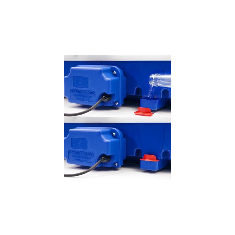 Refilling occurs through two convenient outlets located on the outside of the incubator, avoiding the need to open the lids and the resulting drastic humidity loss, which is necessary for models with an internal tray. The external outlets are closed with special "Dust Stop" caps, also made of ABS polymer with BIOMASTER silver ion antibacterial additive. The caps prevent water contamination by germs and dust, keeping the environment around the eggs cleaner and more hygienic.