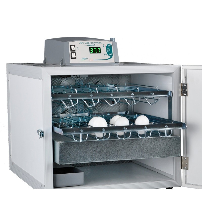 The FIEM MG70/100 Family Mini LED Advanced SH with weekly charging is one of the most versatile incubators in the FIEM range, designed for demanding breeders who require efficiency, autonomy and compactness . Thanks to the removable baskets , it allows you to incubate and hatch progressively and weekly, up to 105 chicken eggs or 300 quail eggs , with electronically controlled temperature and automatic egg rotation .