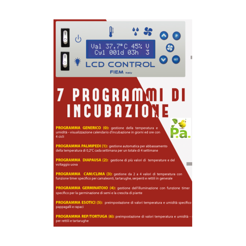 INCUBATION CALENDAR -The LCD control unit is equipped with the new “incubation calendar” program for managing from 1 to 4 incubation cycles, this will allow you to load single batches of eggs, for example on a weekly basis, displaying the elapsed incubation time, you will therefore have precise track of the entire period so you can define the exact days of the hatching cycle without having to calculate them in your head and risk making mistakes!!!