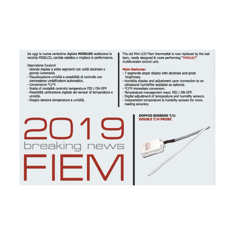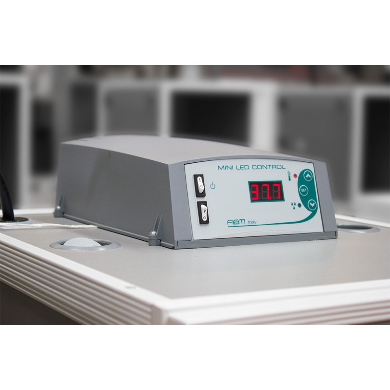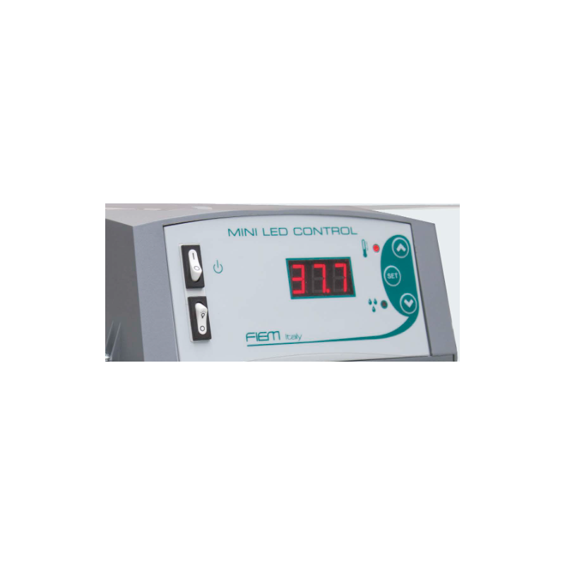 The FIEM Mini LED control unit is an advanced incubator control system, designed to ensure precise temperature and humidity management. Equipped with a large seven-segment display, it offers clear and immediate readings. Thanks to the connection to the FIEM Limpia automatic humidifier, it allows direct humidity control.