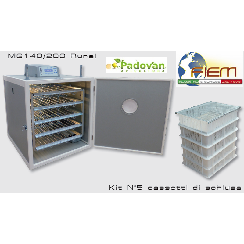 L'incubateur rural FIEM MG 140/200 à chargement unique est idéal pour ceux qui recherchent une machine spacieuse, professionnelle et facile d'utilisation , conçue pour des cycles complets d'incubation et d'éclosion en une seule session. Fabriqué en PVC isolé de 2 cm (acier prélaqué en option) , il garantit une isolation thermique optimale, une hygiène irréprochable et un nettoyage aisé. Disponible en deux versions ( MG 140 et MG 200 ), il peut traiter jusqu'à 200 œufs de poule ou 800 œufs de caille grâce à une rotation automatique et une ventilation tangentielle forcée .